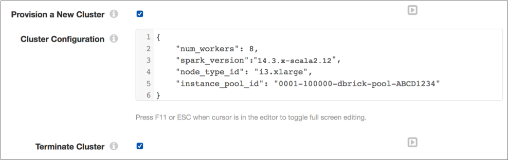 For example, the following set of properties provisions a cluster to run the pipeline that uses the specified instance pool, then terminates the cluster after the pipeline stops: