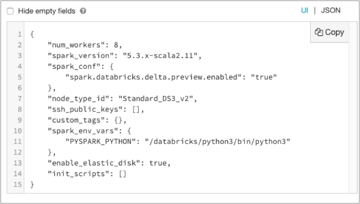 To locate the valid cluster configuration property names and values, launch your Databricks workspace and view the properties used to create a job cluster.