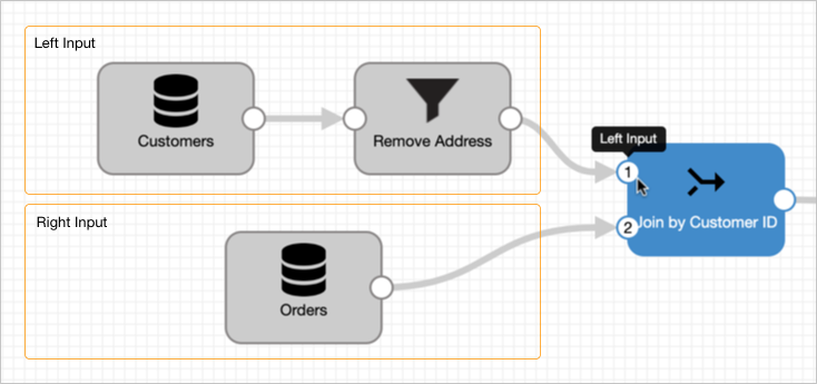 For example, in the following image, the customers input stream represents the left input because it was connected to the processor first. The orders input stream represents the right input because it was connected to the processor second.