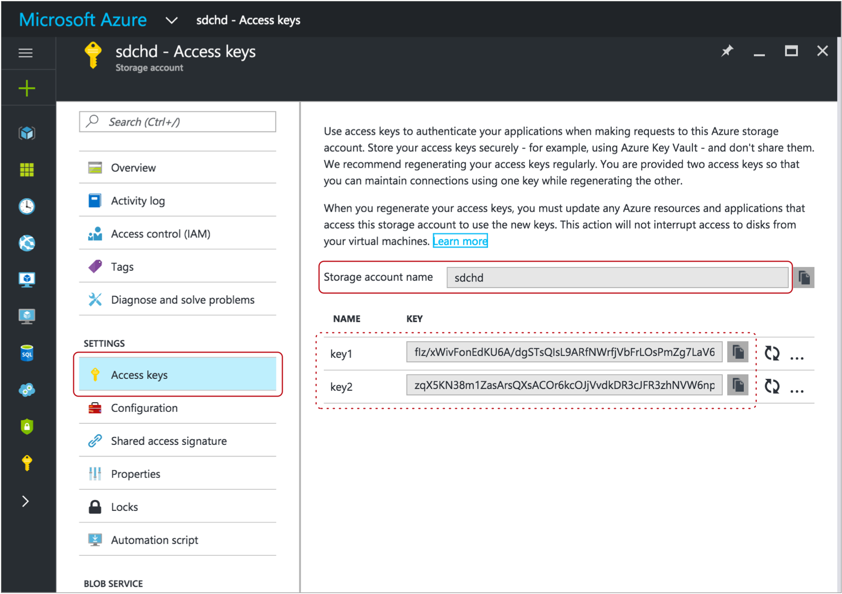 key value for the Azure storage account. You can use any valid key.Tip: The account key value also displays on the Access Keys page. For example, on the image above, you could use either the key1 or key2 value.