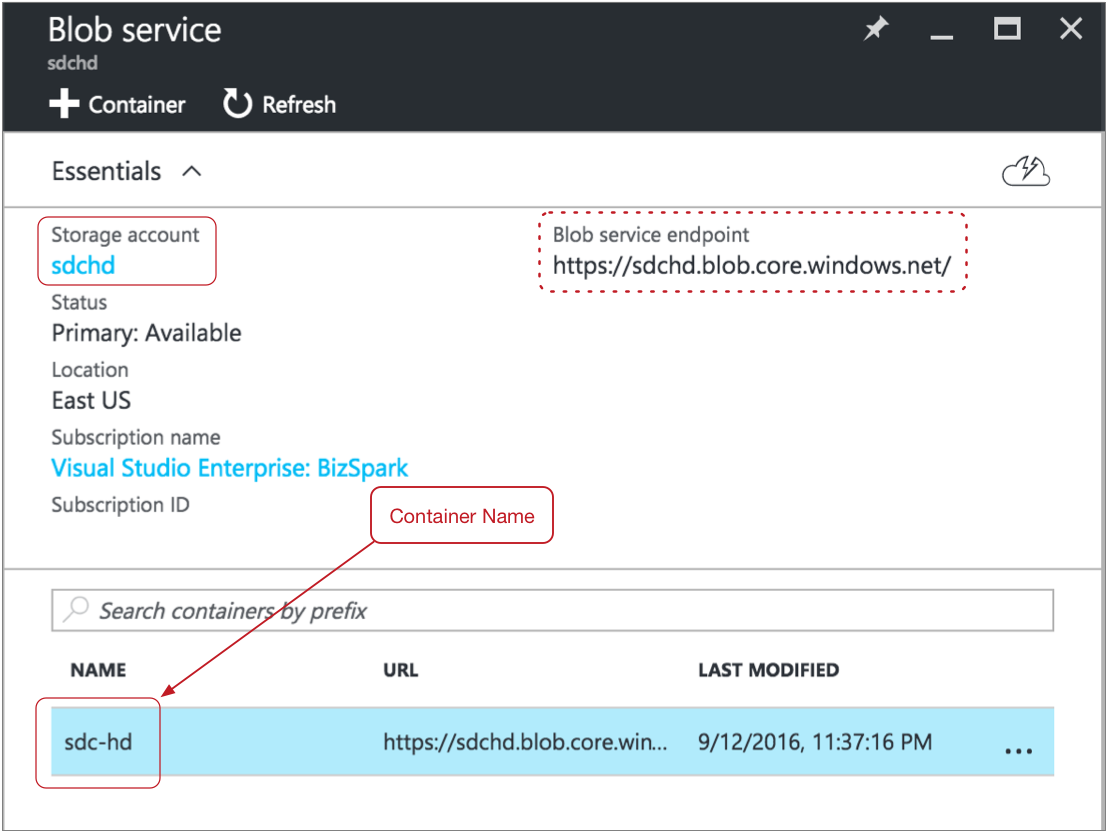 For example, for asdc-hdcontainer in a storage account namedsdchd, with all files in a files directory, you would define the file system URI as follows:wasbs://sdc-hd@sdchd.blob.core.windows.net/filesTip: You can find the container name and storage account name on the Essentials page in the Microsoft Azure portal. For a standard storage account, in the Microsoft Azure portal, click . For a blob storage account, click .The page shows the container name and storage account name: