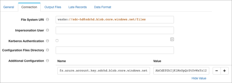 core-site.xmlfile, configure the destination to pass an additional configuration property that contains the Azure credentials:- On the Connection tab, configure the