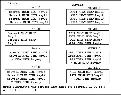 - API D contains key14, key24, and key34. Key14 enables API D to communicate with Server A because Server A also contains the key14 entry. You must ensure that API4 is the host name on which API D resides and that Server1 is the host name on which Server A resides.