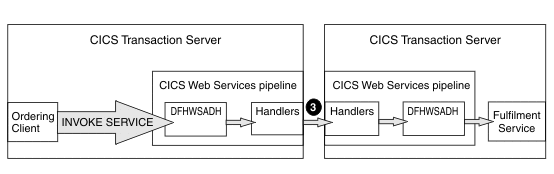 Figure 3 shows the request from the Ordering Client to the Fulfilment service. This request involves a web services pipeline that includes the CICS web services addressing handler, DFHWSADH.Figure 3. Request from the Ordering Client to the Fulfilment Service