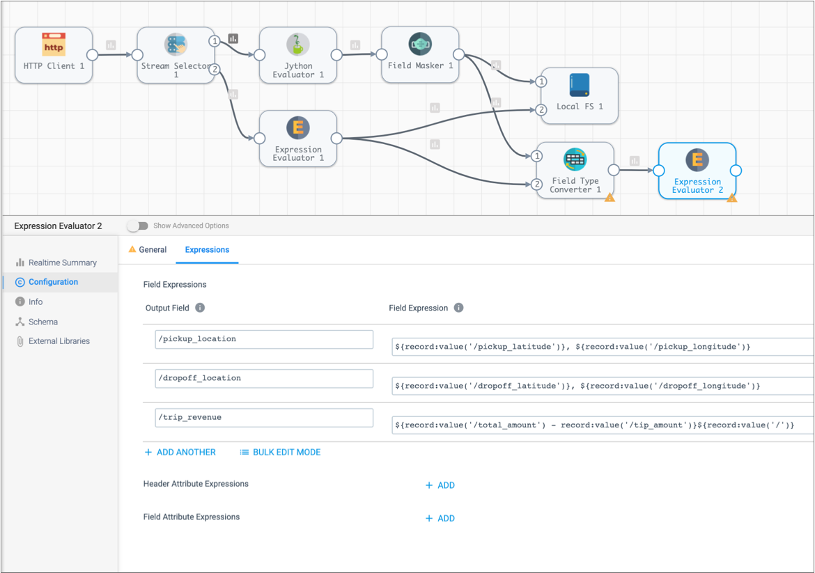 Now we'll use an Expression Evaluator processor to create pickup and dropoff location fields that merge the latitude and longitude details. We'll also calculate the basic trip revenue by subtracting the tip from the total fare.