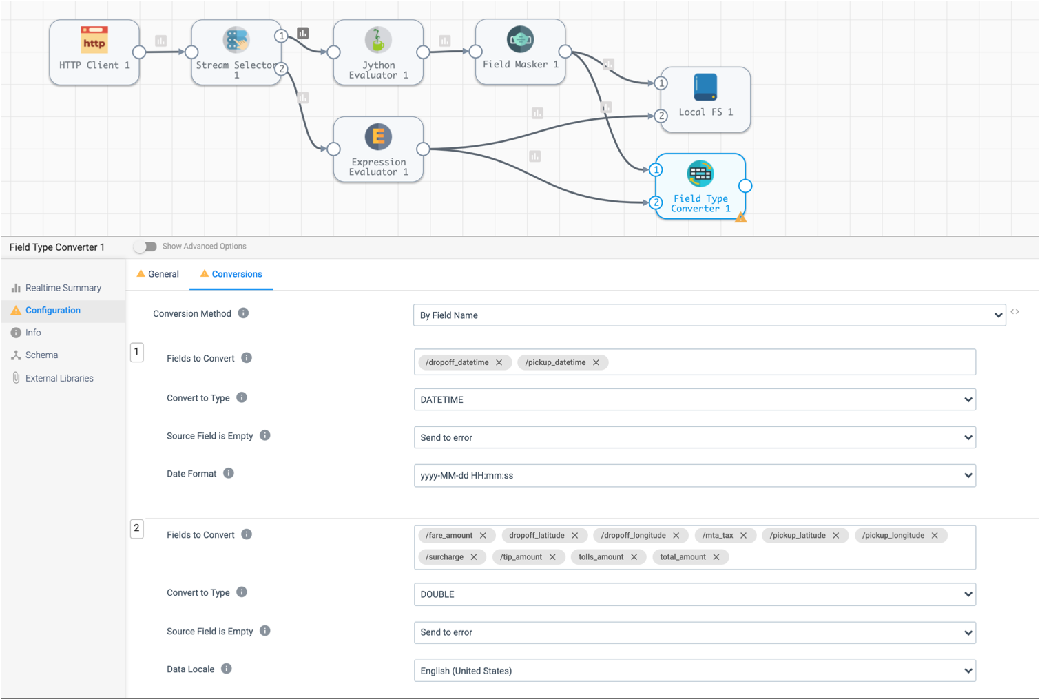 The Field Type Converter changes the data type of a few fields. We'll take a look at that stage and try changing stage configuration.
