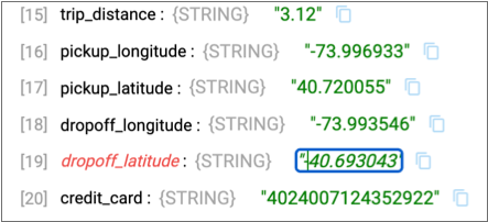 2. In the first input record, in the Output Data column, click on the dropoff_latitude data, 40.693043, add a negative sign before the data. Press Enter or click outside the data.