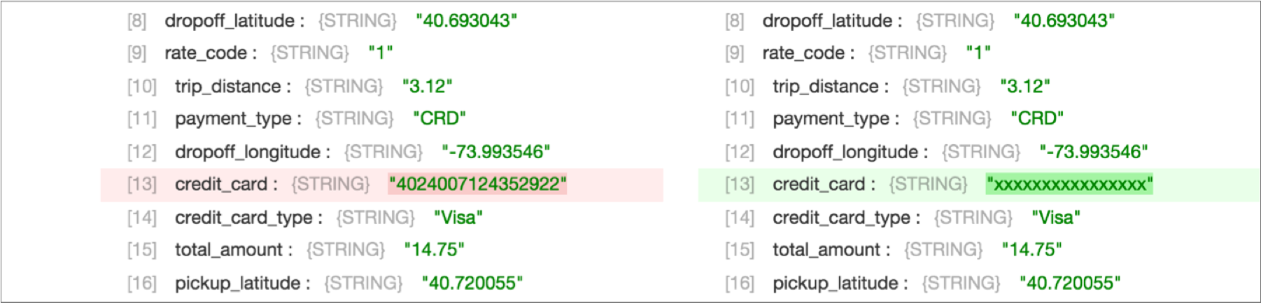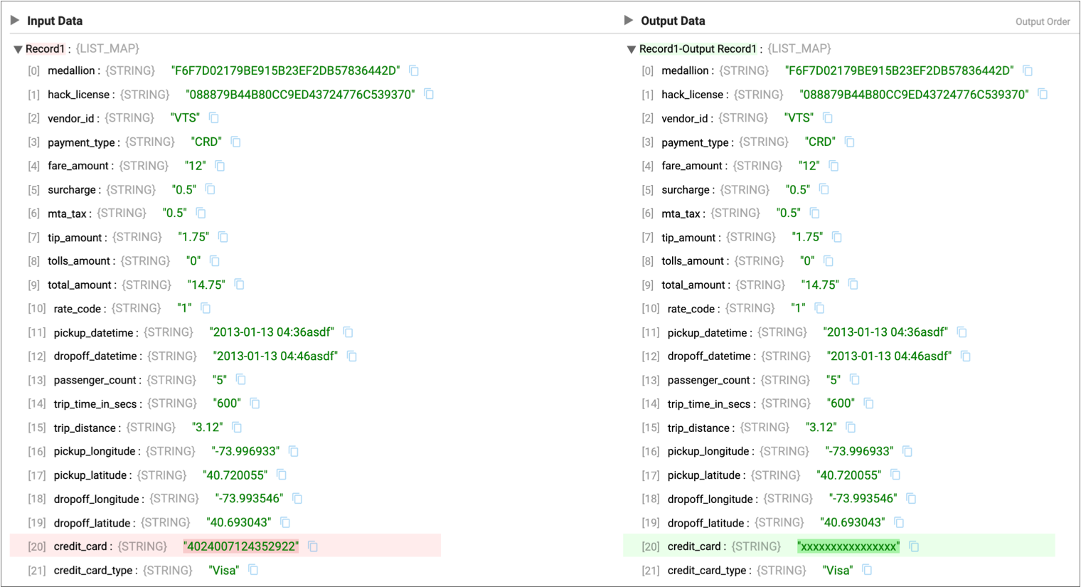 6. Expand an output record, and notice how the entire credit card number is now masked: