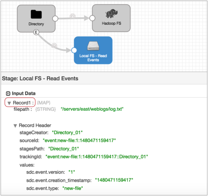 For example, the Directory origin below generates an event record as it starts reading a file for data preview:
