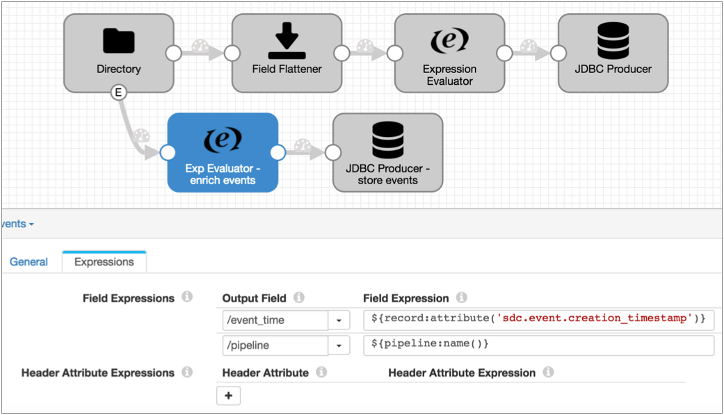 For example, you might add an Expression Evaluator to add the event generation time to an event record before writing it to a destination. Or, you might use a Stream Selector to route different types of event records to different executors.