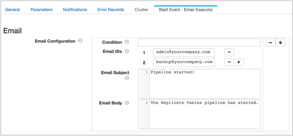Say you want to send an email when the pipeline starts. First, you configure the pipeline to use the Email executor for the pipeline start event. Since you don't need the Stop event, you can simply use the default discard option: