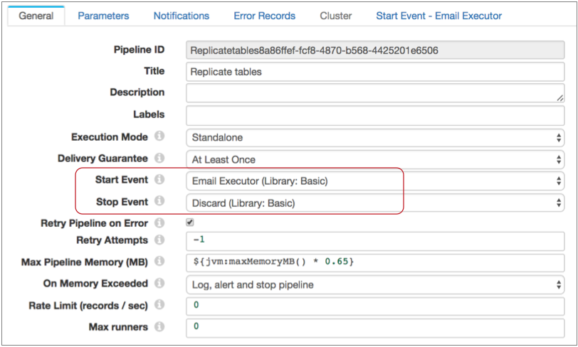 - Pipeline events are generated when the pipeline starts and stops. For details, see Pipeline Event Generation.