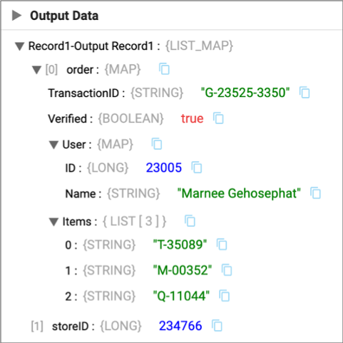 <root><Verified>true</Verified><Items>T-35089</Items><Items>M-00352</Items><Items>Q-11044</Items><TransactionID>G-23525-3350</TransactionID><User><ID>23005</ID><Name>Marnee Gehosephat</Name></User></root>The processor generates the following record when configured to replace the
