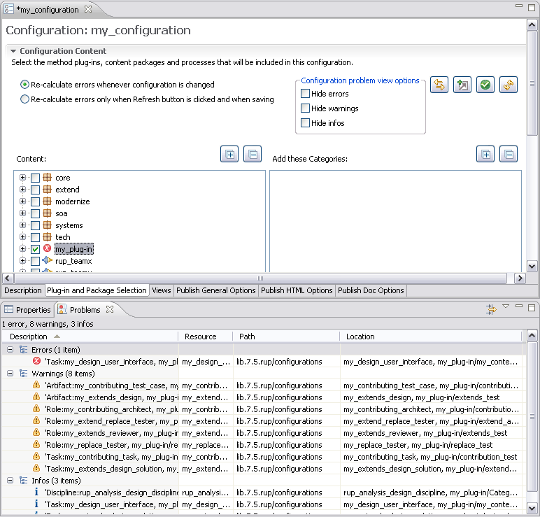 - Click the Plug-in and Package Selection tab. In the list of plug-ins, check My Plug-in, which you created in the Create Method Content tutorial. This method plug-in has RUP as a base and references parts of its content and has elements that extend and replace base content. If you do not have this method plug-in, complete the Create Method Content tutorial before continuing.