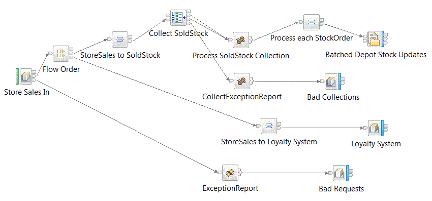- XML StoreSales 訊息透過 Store Sales In 節點進入訊息流程。