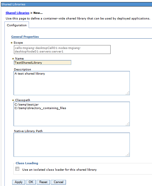 With a server associated shared library, the “utility” class or JAR will loaded within its own classloader created during creation of the shared library. In the administration console do the following: - Select the Application Server the library is associated to.