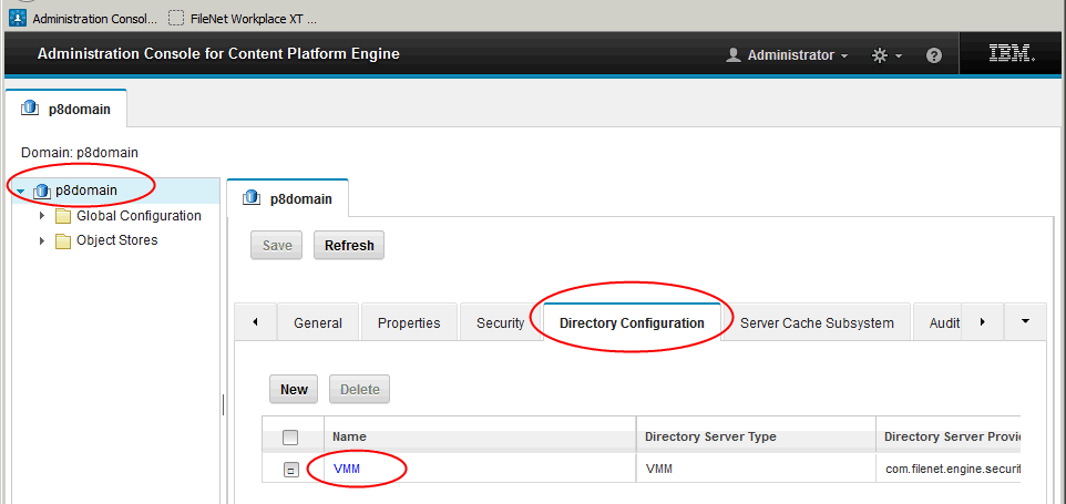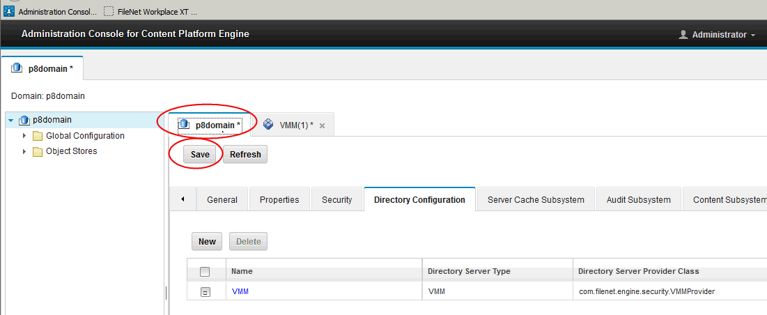 - Via ACCE, select the Domain, followed by the Directory Configuration tab and then the Name of the Directory Server.