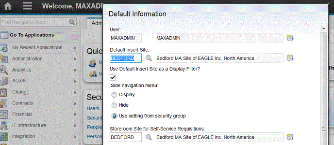 By default this is set to "Use setting from security group" so the user would continue to see the side navigation menu based on the security settings described above. If the "Display" option is selected then the side menu will always be displayed regardless of the user's security group settings. Alternatively if the "Hide" option is selected then the side menu will not display no matter what the user's security groups are set to. The user level settings can also be found in the User application under Security / Users.