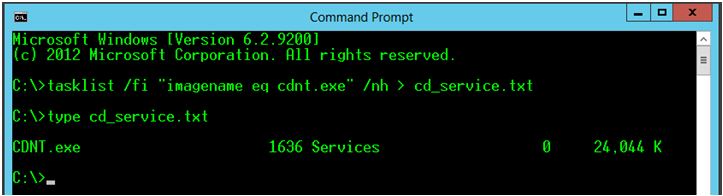 Example: tasklist /fi "imagename eq cdnt.exe" /nh >cd_service.txt