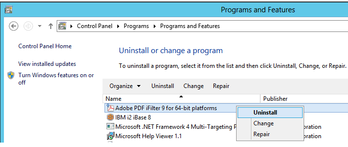 1. Uninstall the current iFilter using the 'Programs and Features' menu in Windows Control Panel