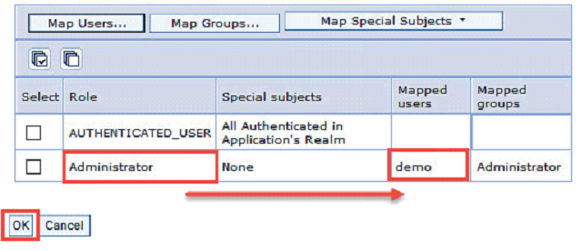 You will then be placed back at the “Security role to user/group mapping” screen. Verify that the user or users desired are listed in the “Mapped users” column directly to the right of the “Administrator” role. Select the “OK” button