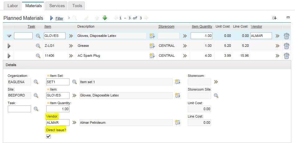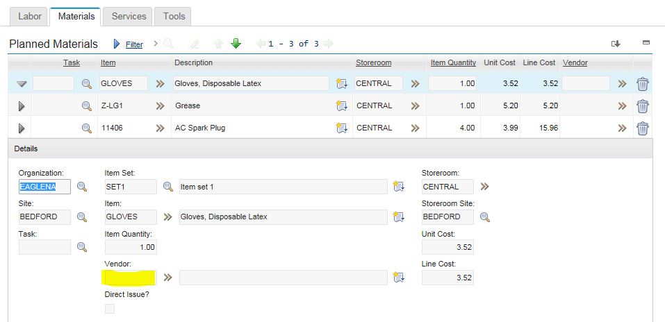 Additionally, the Vendor can be changed to any other valid Vendor as long as the Direct Issue check-box is checked. If the Direct Issue check-box is unchecked, then the expected business process is that any Planned Materials will be requisitioned from a Storeroom in the Site in which the resulting Work Order gets generated.