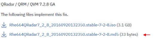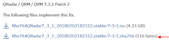 To resolve this problem QRadar lists on Fix Cental either an MD5 or SHA256 hash to validate the build.
