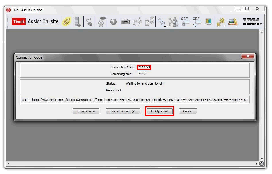 4. Support Center Task: AOS provides you a URL. This URL must be sent to the Customer and the IBM service representative (Notice the Connection Code) as needed. This action needs to be done on the support center's PC.