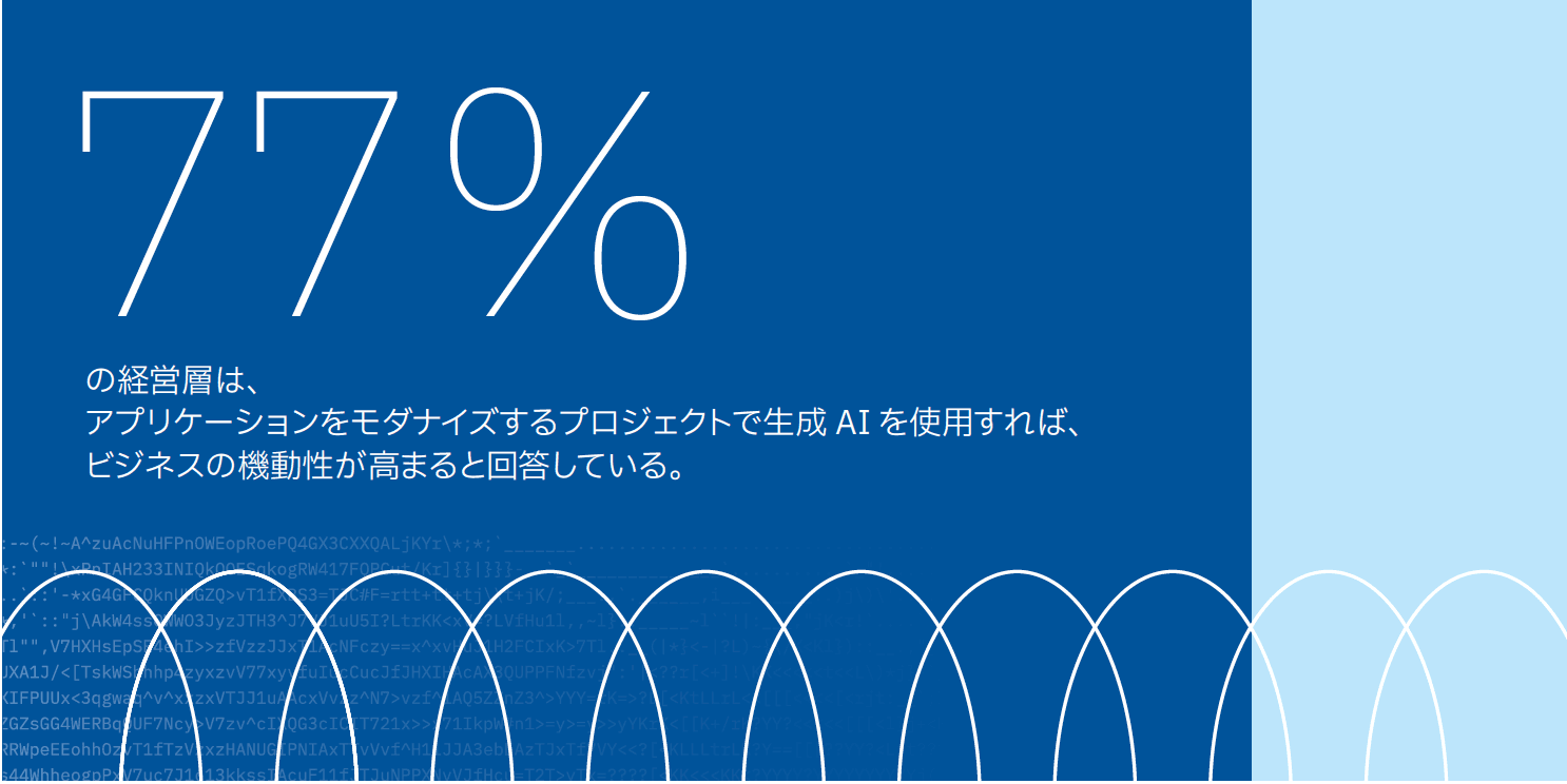 また、経営層の77%は、アプリケーションをモダナイズするプロジェクトで生成AIを使用すれば、ビジネスの機動性が高まると回答しています。さらに、アジャイルなビジネス慣行を取り入れている組織は、収益成長率で他社を上回る割合が49%高いです。