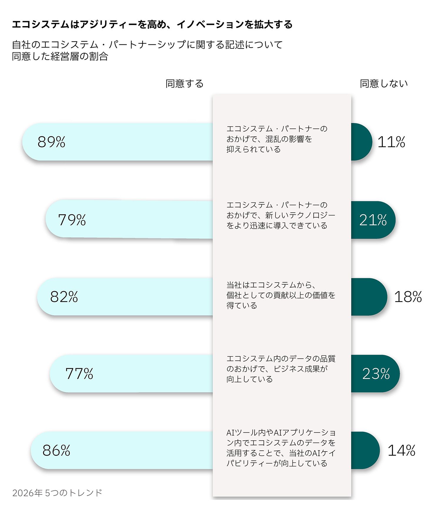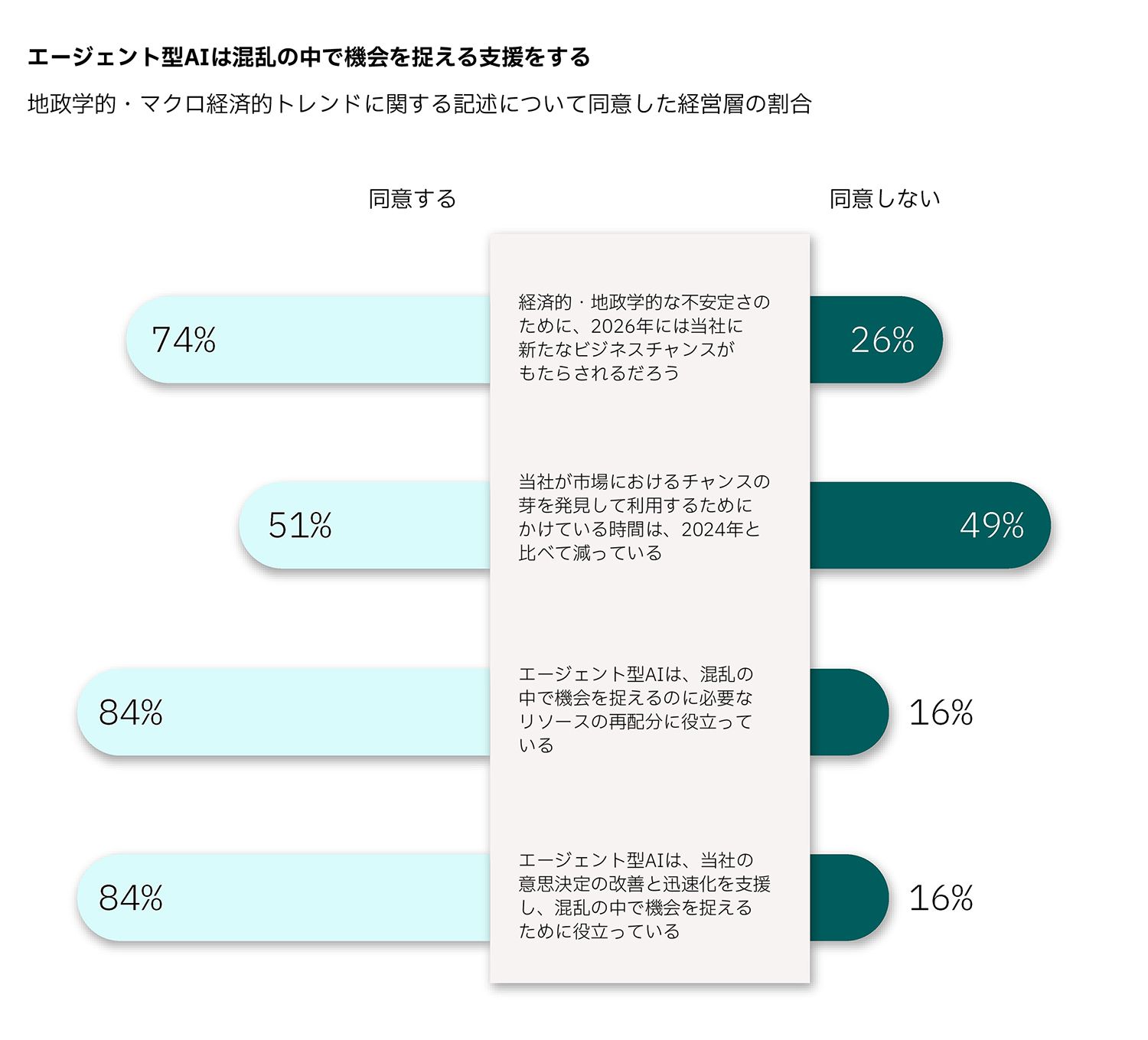この章では、経済や地政学的な不安定さが企業にとって脅威ではなく、むしろ新たなビジネスチャンスの源泉となることを示しています。経営層の74%が「不安定さが新たな機会を生む」と回答し、90%が「リアルタイムで行動できなければ競争力を失う」と認識しています。